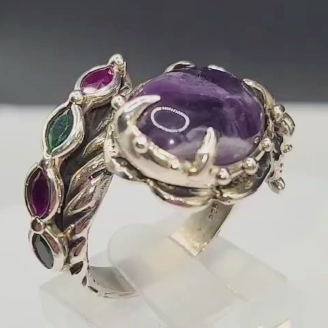 Bague argent 925 cabochon Améthyste et pierres rouges/vertes