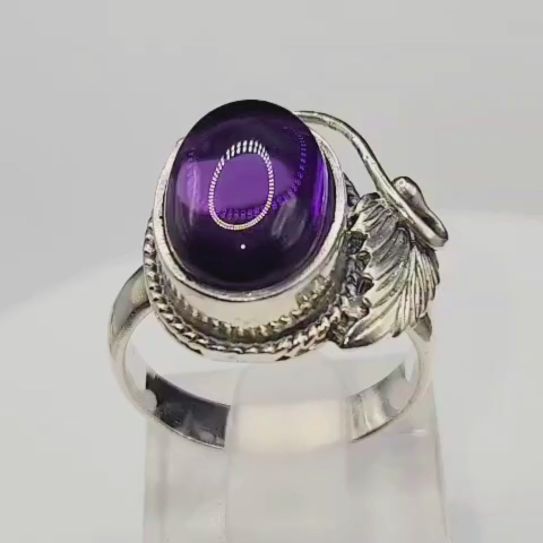 Cette bague en argent 925, proposée par la Bijouterie Vindicta, met à l’honneur une améthyste ovale cabochon d’un violet intense, montée dans un serti raffiné. Les côtés sont décorés de feuilles sculptées, qui ajoutent un caractère naturel et sophistiqué.