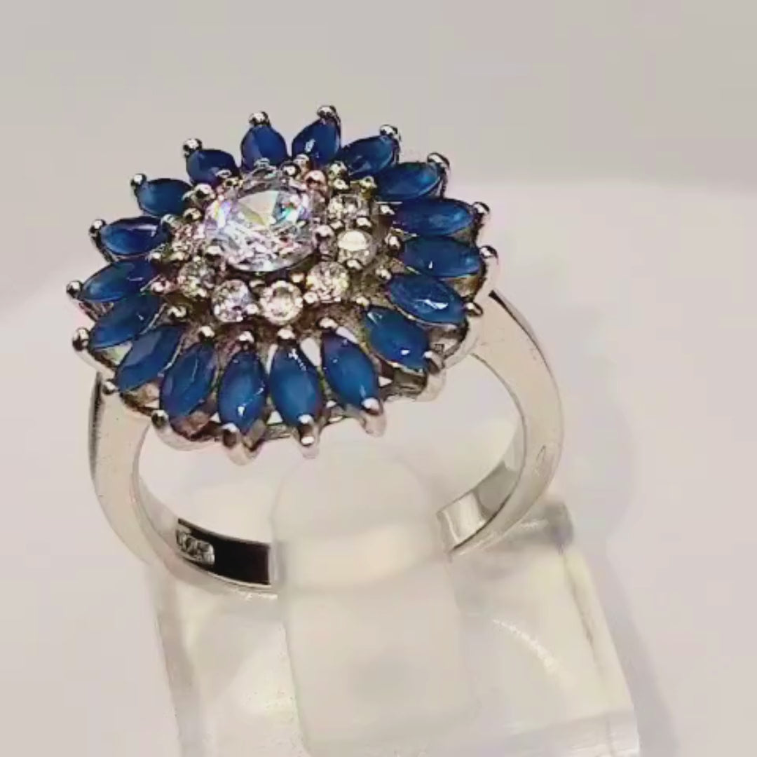 Cette bague en argent 925 adopte une forme florale élégante, ornée d’un zirconium central étincelant entouré de pierres bleues taillées en navette et de petits cristaux clairs.