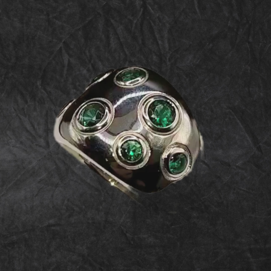 Un bijou audacieux en argent 925 massif, au design large et moderne, orné de pierres vertes rondes serties sur toute la surface.