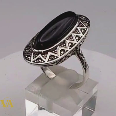 Cette bague en argent 925 massif poinçonné présente un superbe cabochon d’onyx noir, long et profond, entouré d’un décor géométrique finement incrusté de marcassites scintillantes.