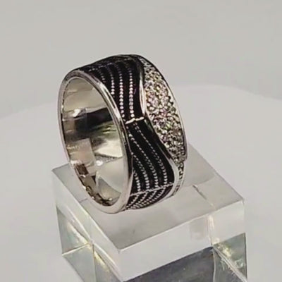 Travaillée en argent 925 poinçonné, cette bague ruban dessine une vague bicolore : un pavage de zirconiums blancs apporte l’éclat, tandis qu’un fond noir oxydé et des micro-perlages soulignent les lignes pour un contraste très joaillier. Le profil lisse à l’intérieur la rend ultra confortable au quotidien. Une pièce mixte, parfaite seule ou en stacking.