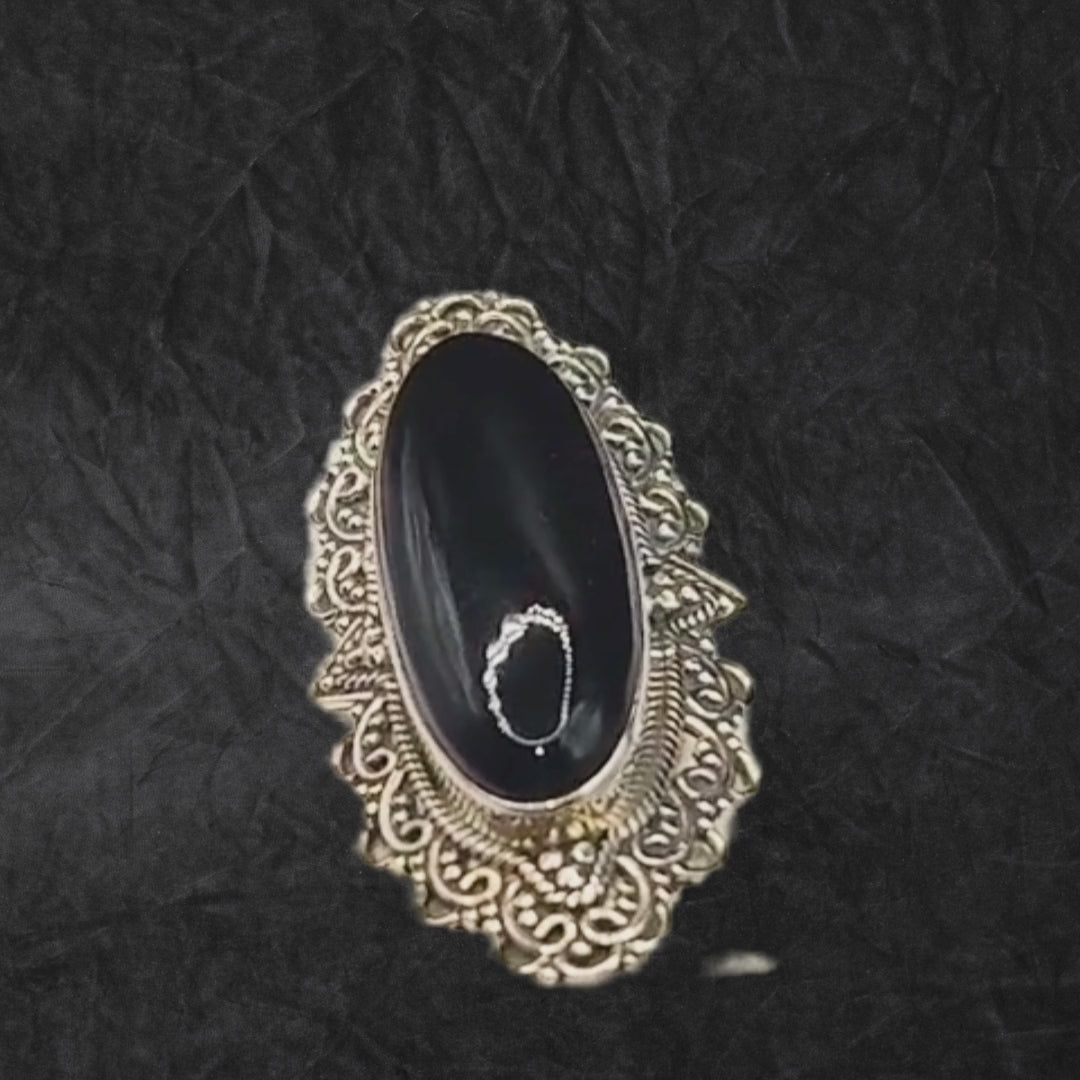 Un bijou d’exception qui allie l’élégance de l’onyx noir ovale à une monture en argent 925 massif richement travaillée.