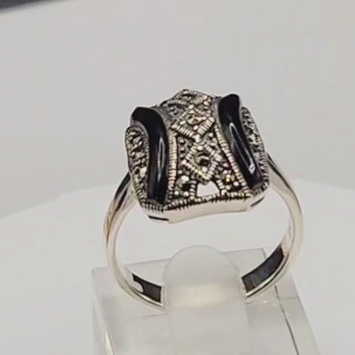 Cette bague en argent 925 arbore une monture rectangulaire élégamment décorée de marcassites scintillantes et d’incrustations d’onyx noir.