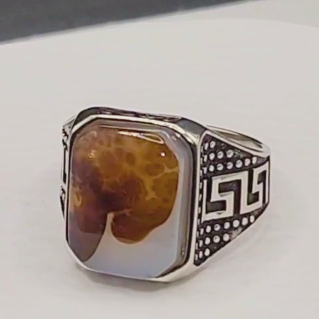 Bague Homme Argent 925 – Agate Fleur rectangulaire & motifs ciselés