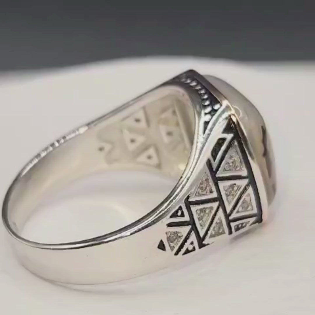Cette bague en argent 925 massif met en valeur une agate naturelle taillée en cabochon, pierre fine connue pour ses nuances nuageuses et ses contrastes uniques.