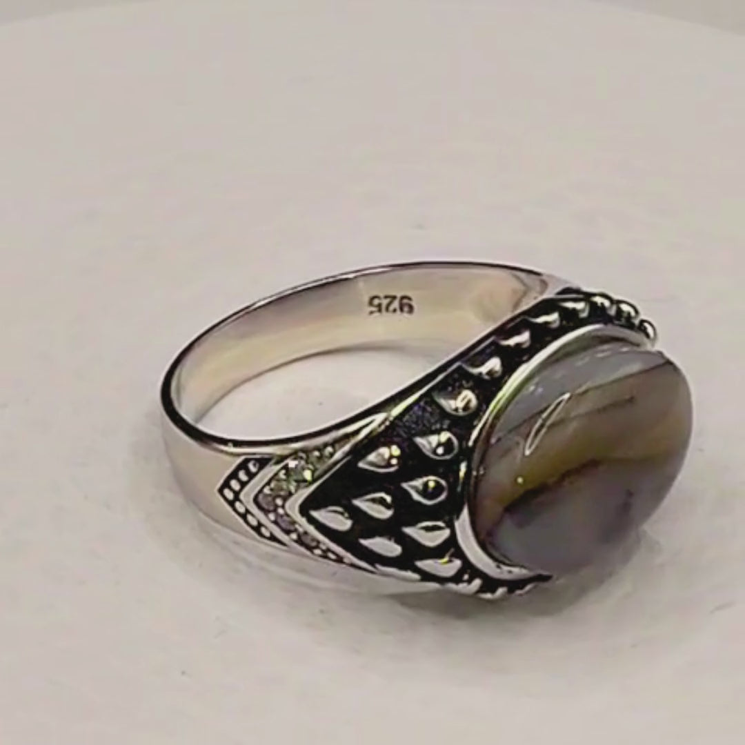 Un bijou en argent 925 massif poinçonné, orné d’une agate naturelle ovale aux reflets bruns et gris, unique par ses nuances.