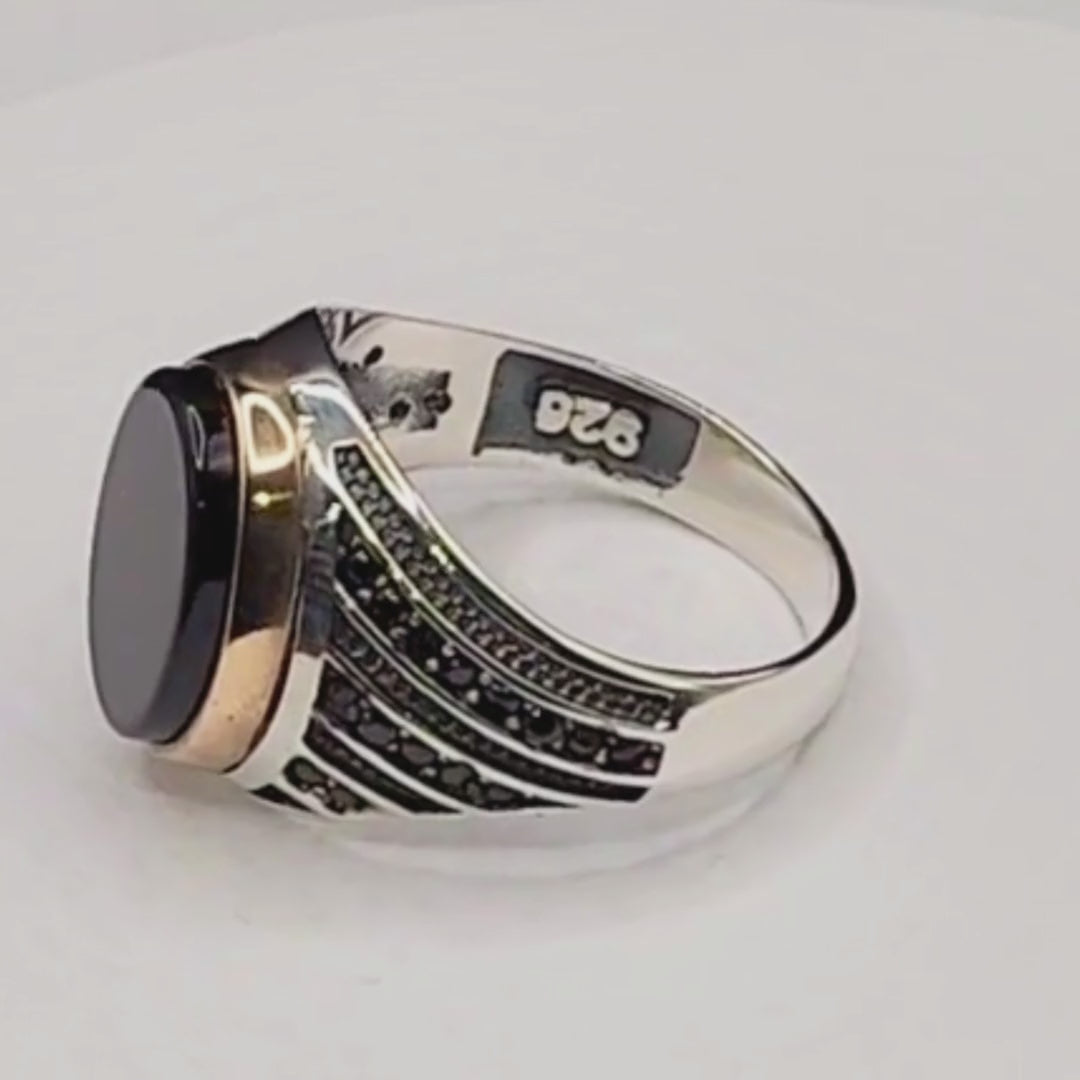Un bijou audacieux en argent 925 massif poinçonné, orné d’un onyx noir ovale cabochon à la brillance profonde.