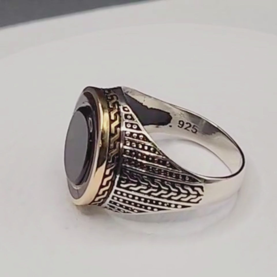 Un bijou audacieux en argent 925 massif poinçonné, orné d’un onyx noir rond cabochon à l’éclat profond.
