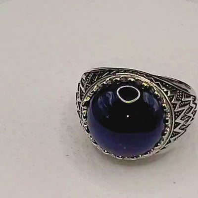 Un bijou masculin en argent 925 massif poinçonné, serti d’une pierre naturelle agate bleue en cabochon bombé.