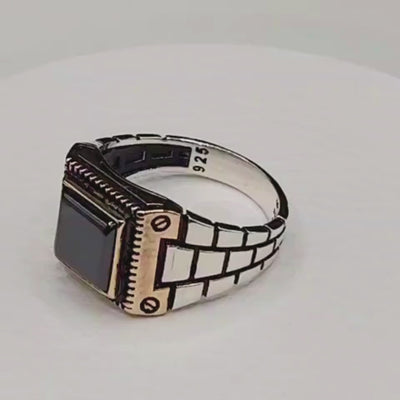 Cette bague en argent 925 massif associe élégance et caractère. Son sertissage carré met en valeur une pierre d’onyx noir, rehaussée par un encadrement bicolore aux détails finement ciselés. Le contraste entre l’argent et les finitions dorées donne à ce bijou une allure moderne et affirmée.