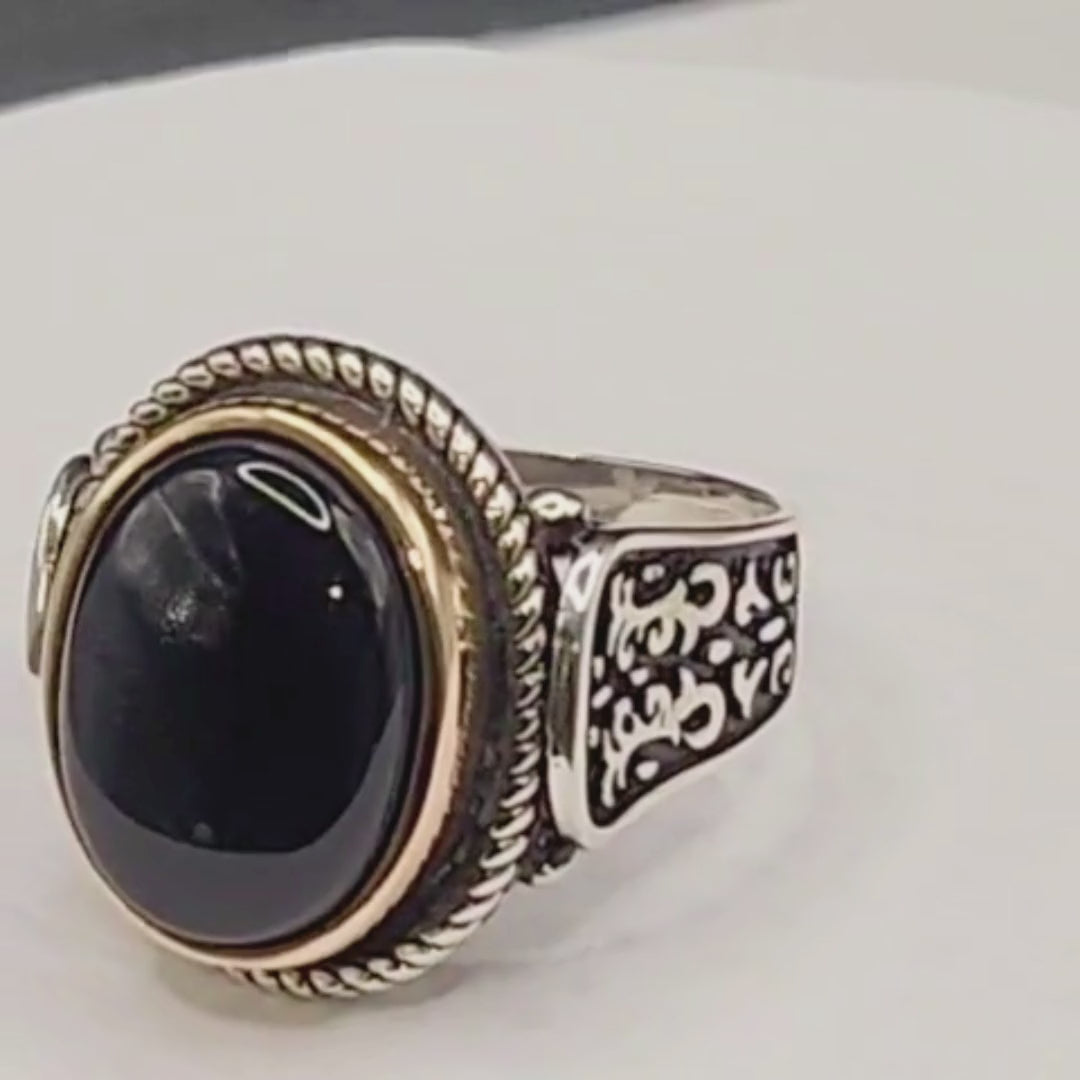 Cette bague en argent 925 massif poinçonné se distingue par son grand onyx noir ovale, mis en valeur par un sertissage travaillé et un anneau aux motifs ciselés.
