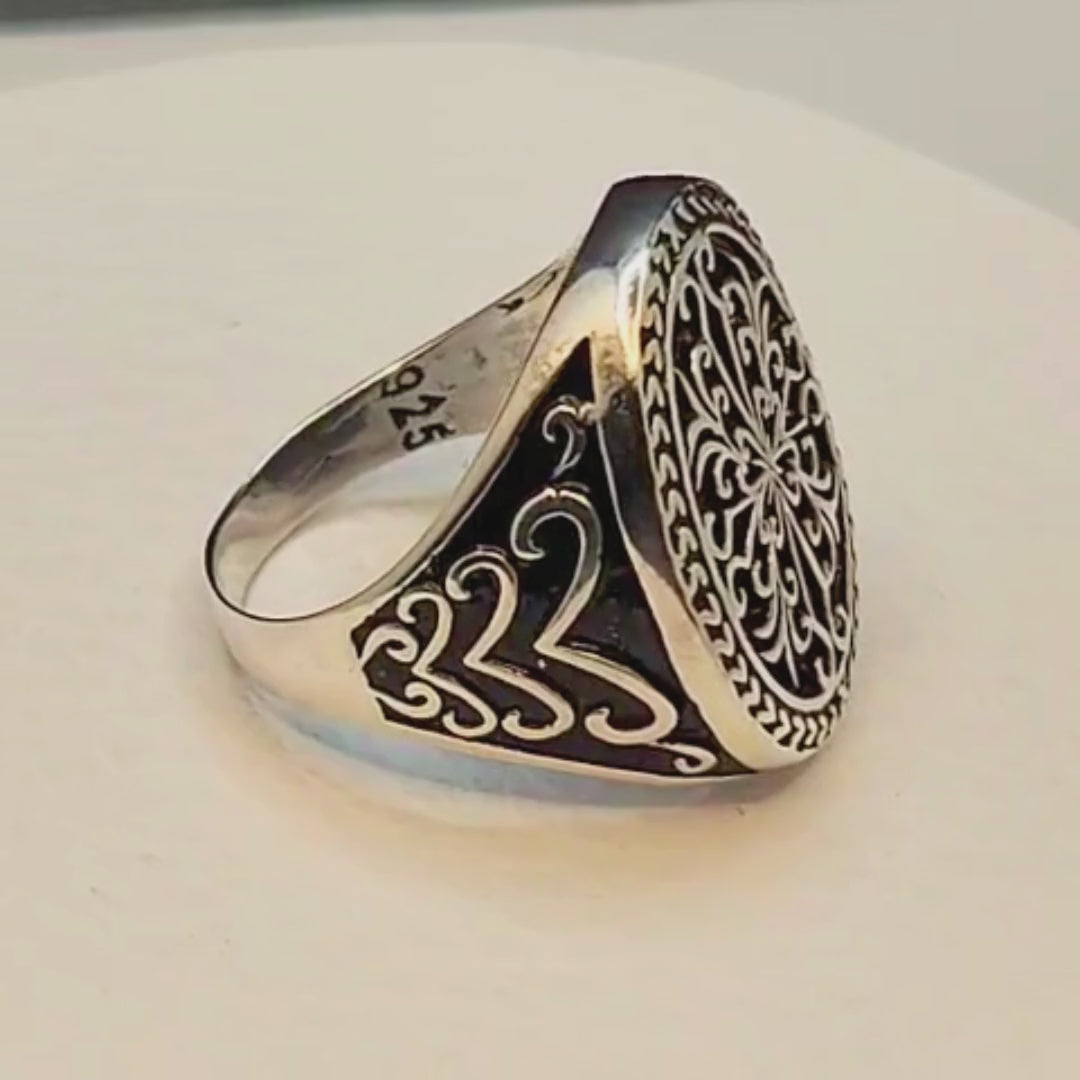 Un bijou masculin au design affirmé, cette bague en argent 925 massif se distingue par son large plateau orné de motifs ciselés. Inspirée de l’art ornemental oriental, elle combine élégance intemporelle et caractère affirmé. La monture imposante et finement travaillée en fait une pièce de style, idéale pour un look raffiné et unique.