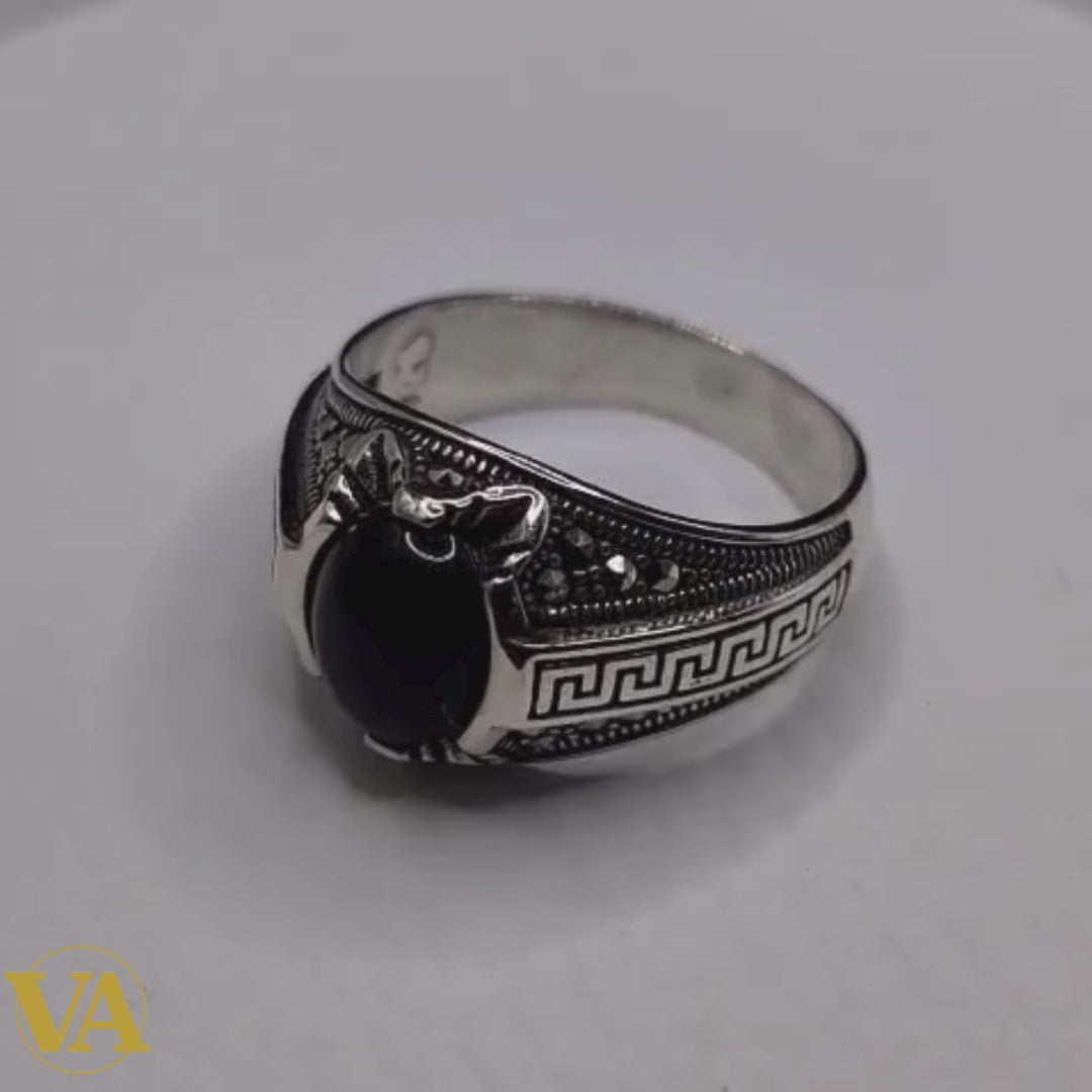 Cette bague en argent 925 massif met en avant un cabochon d’onyx noir naturel, pierre réputée pour son intensité et son élégance masculine.