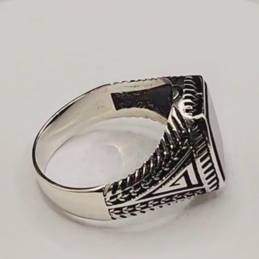 Un design sobre et puissant : cette bague en argent 925 massif poinçonné est sertie d’un onyx noir rectangulaire poli qui capte la lumière avec intensité.