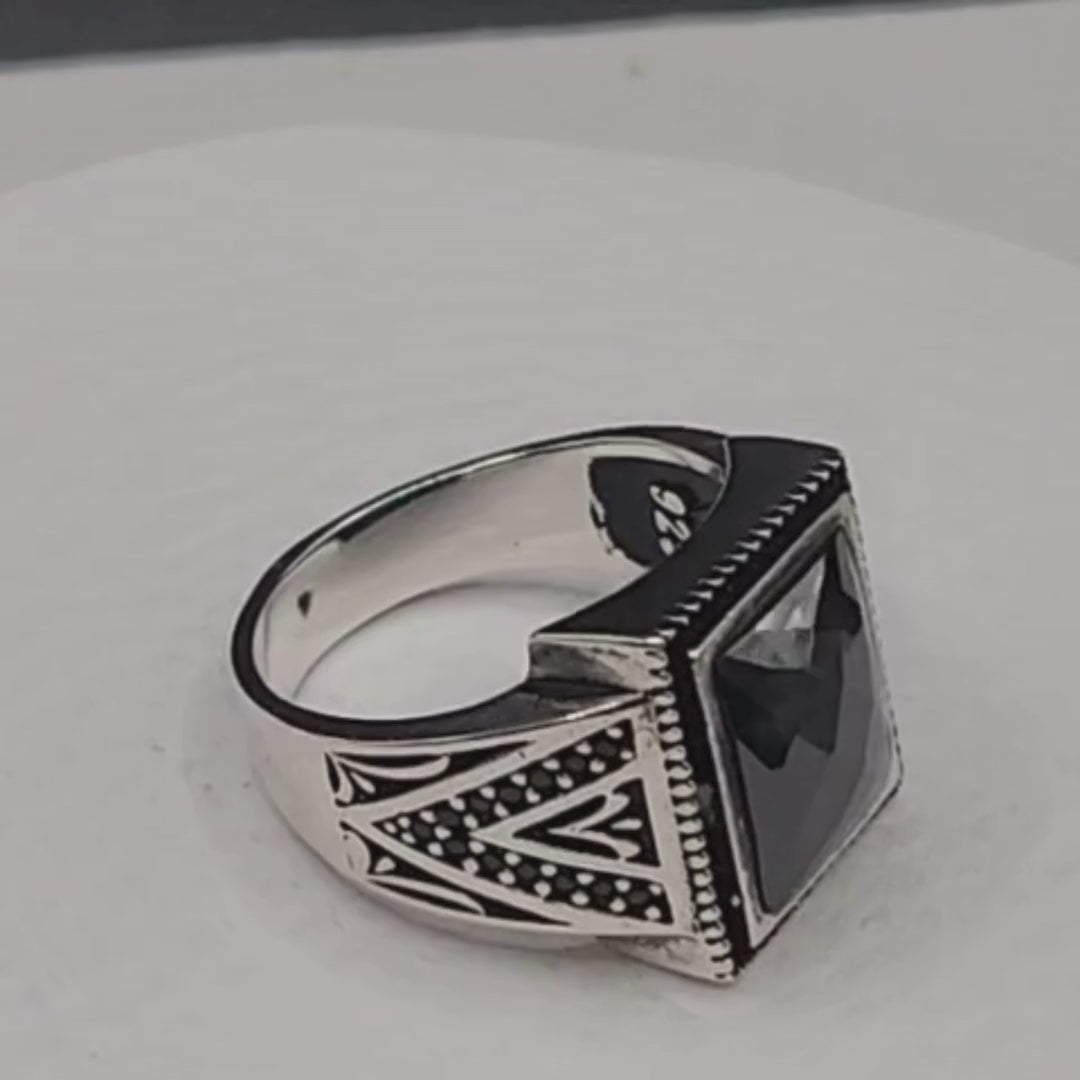 Un bijou à la fois puissant et raffiné en argent 925 massif poinçonné, orné d’une onyx noire naturelle taillée en facettes rectangulaires.