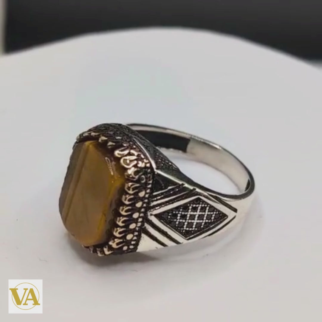 Cette bague en argent 925 met en avant un cabochon d’œil de tigre rectangulaire aux bords arrondis, avec ses reflets dorés caractéristiques qui changent à chaque mouvement.