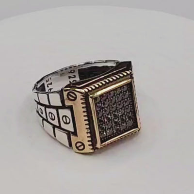 Cette bague en argent 925 massif attire tous les regards grâce à son sertissage rectangulaire pavé d’oxydes de zirconium finement taillés, offrant un éclat comparable à celui du diamant. L’encadrement doré bicolore et les flancs gravés au style géométrique confèrent à ce modèle un caractère moderne et puissant.
