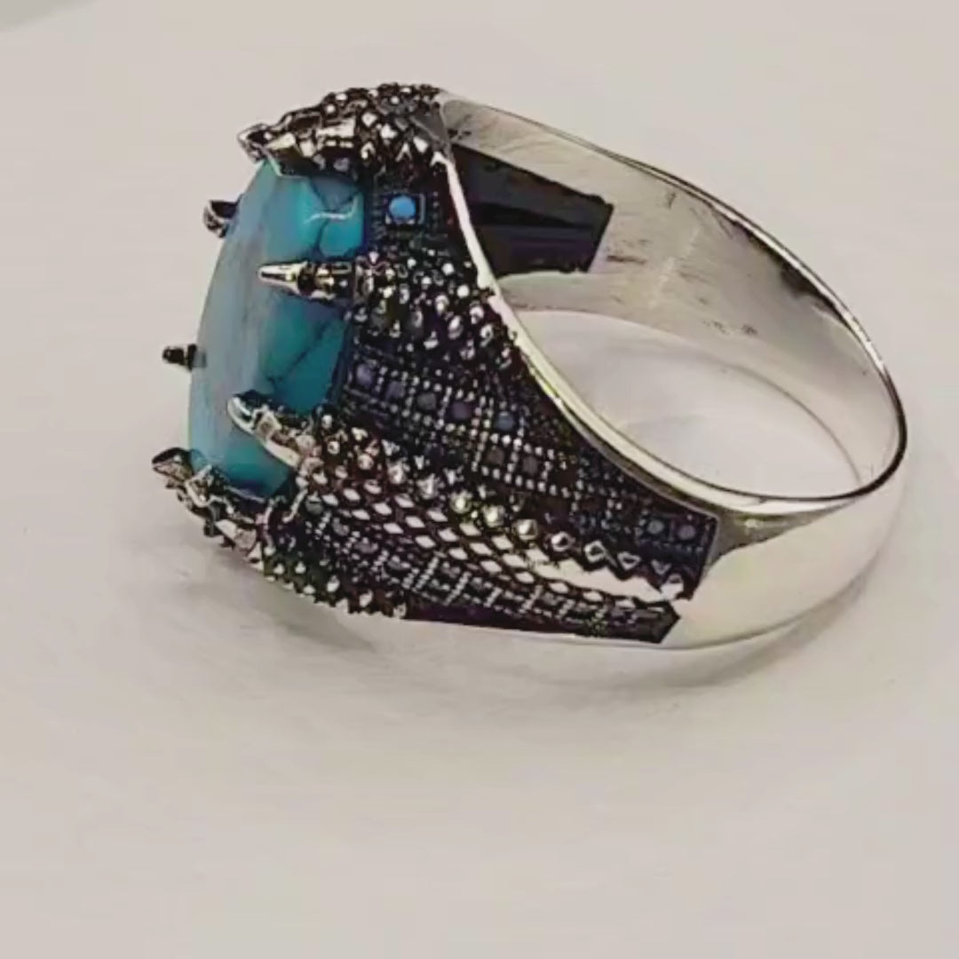 Bague Homme Argent 925 – Turquoise ovale cabochon & griffes protectrices