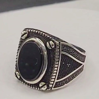 Cette bague en argent 925 massif poinçonné se distingue par son onyx noir ovale, serti dans un design masculin travaillé aux détails industriels.