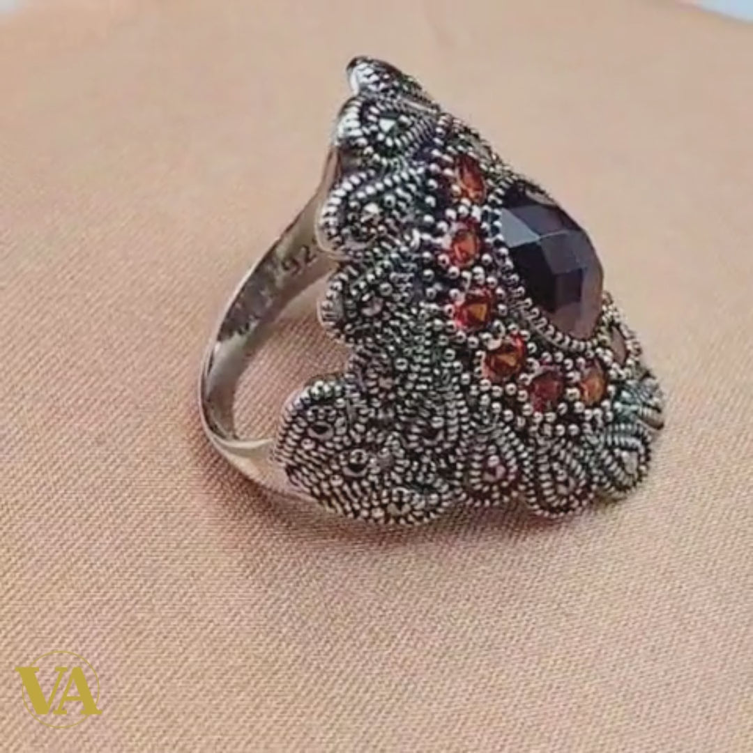 Bague ovale en argent 925, pierres rouges & marcassite – Modèle imposant