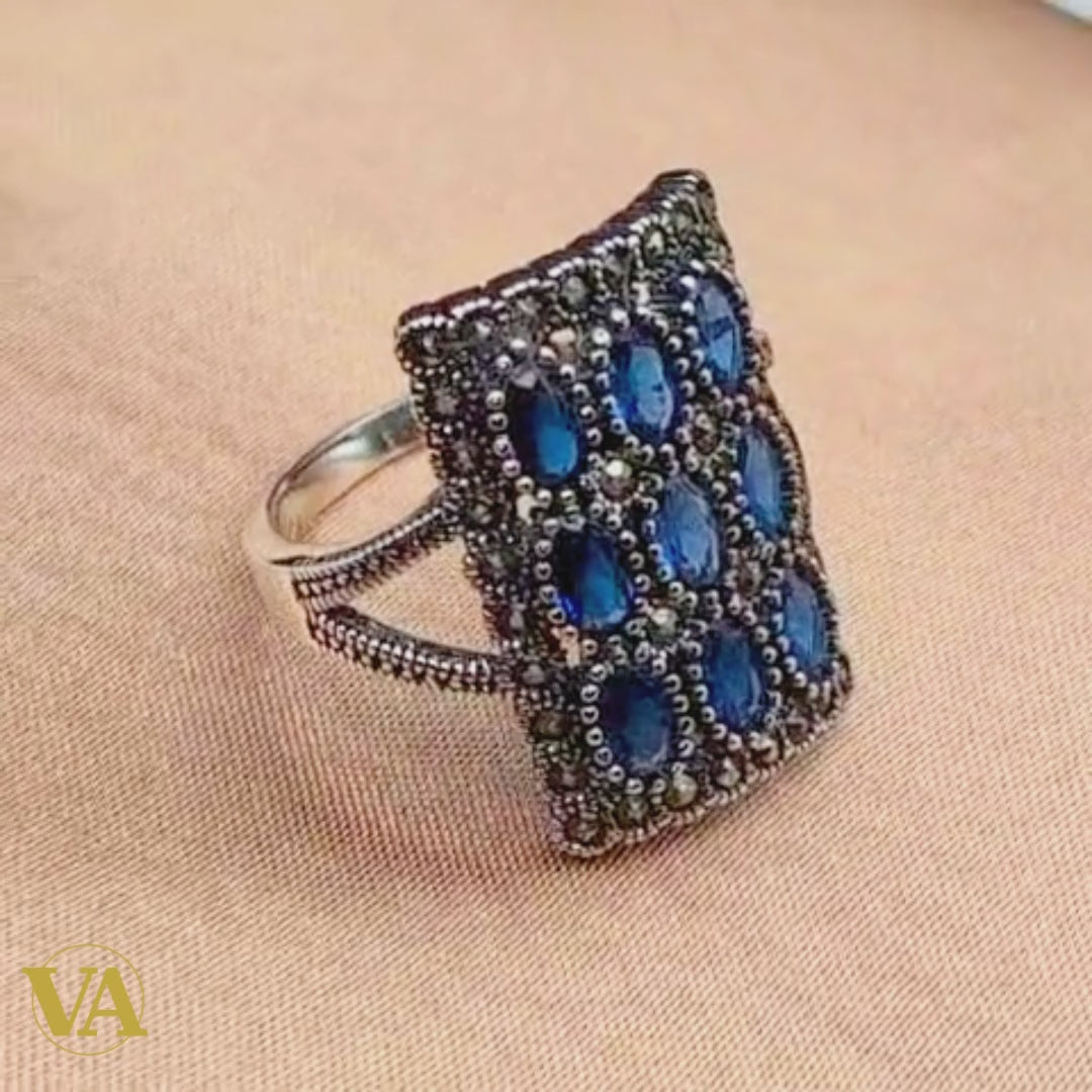 Bague rectangulaire en argent 925, pierres bleues & marcassite
