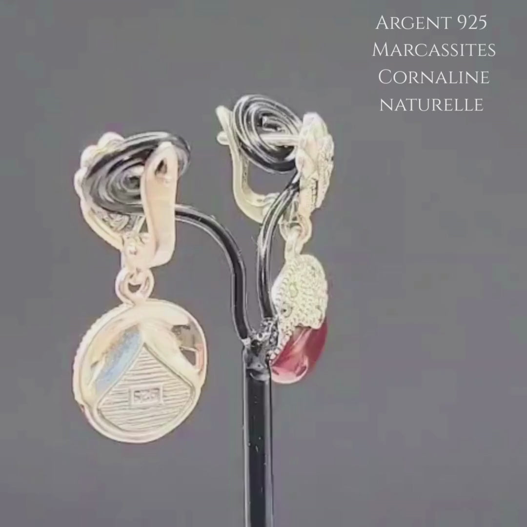 Boucles d’oreilles en argent 925, marcassite & cornaline