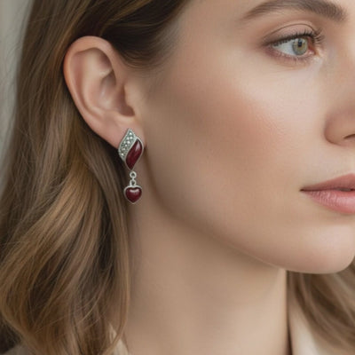 Ces boucles d'oreilles incarnent l'excellence Vindicta : une cornaline taillée en marquise surmontée de marcassite, reliée à un cœur de cornaline suspendu. Le contraste entre le rouge chaleureux de la cornaline et l'éclat argenté de la marcassite crée une harmonie visuelle captivante.