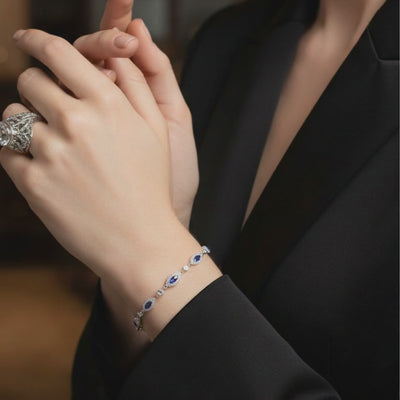 Il est composé d’une succession d’améthystes taillées en forme navette, mises en valeur par un sertissage soigné et entourées d’un pavage d’oxydes blancs scintillants.