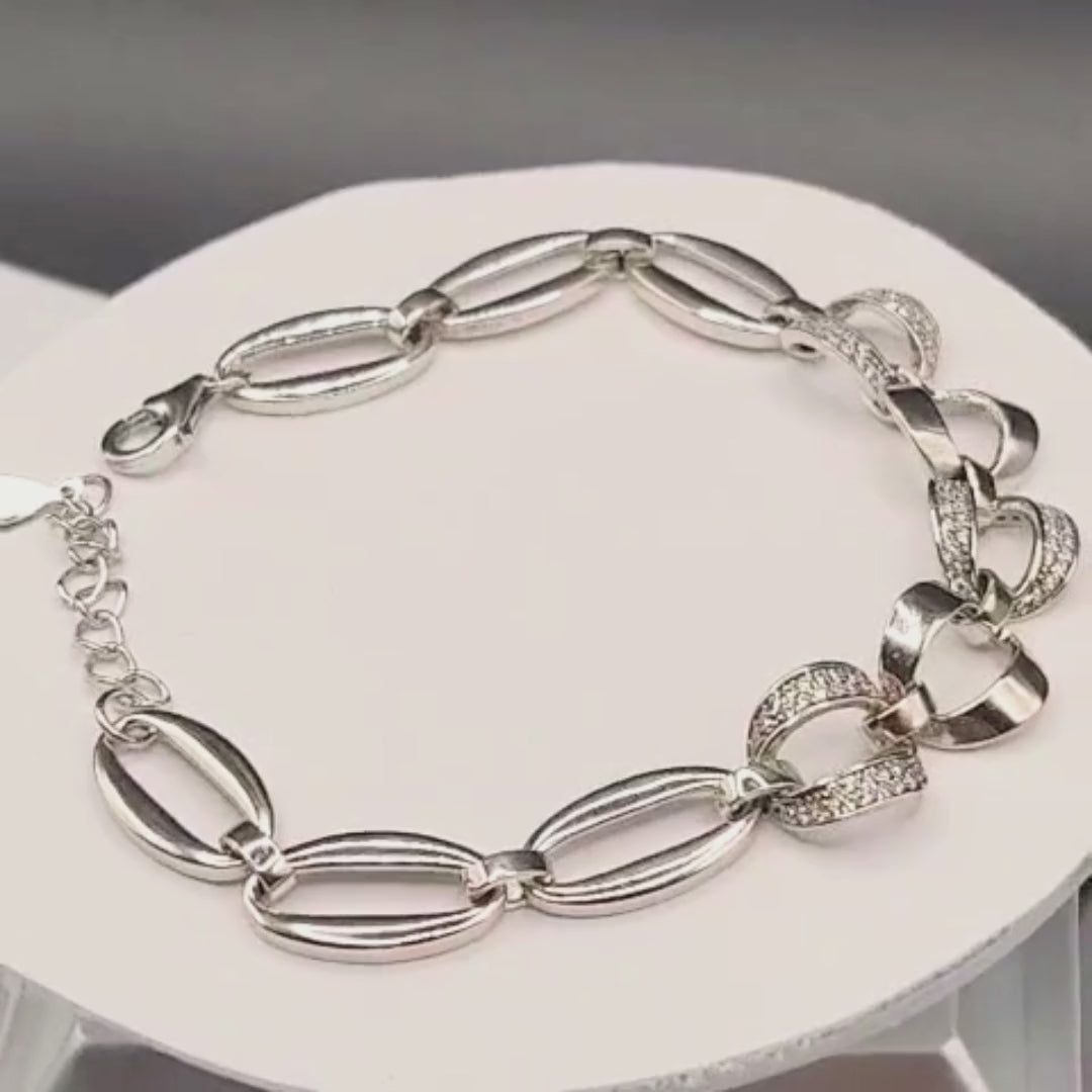 Ce bracelet en argent 925 séduit par son jeu de maillons ovales et larges, dont certains sont sertis de zircons éclatants. Son design intemporel et élégant en fait un bijou polyvalent, parfait pour illuminer vos tenues du quotidien ou sublimer une soirée. Grâce à sa chaînette d’extension, il s’adapte aisément à votre poignet, offrant à la fois confort et raffinement.