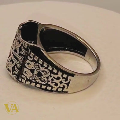 Chevalière Homme Argent 925 – Onyx Noir et Gravures Orientales